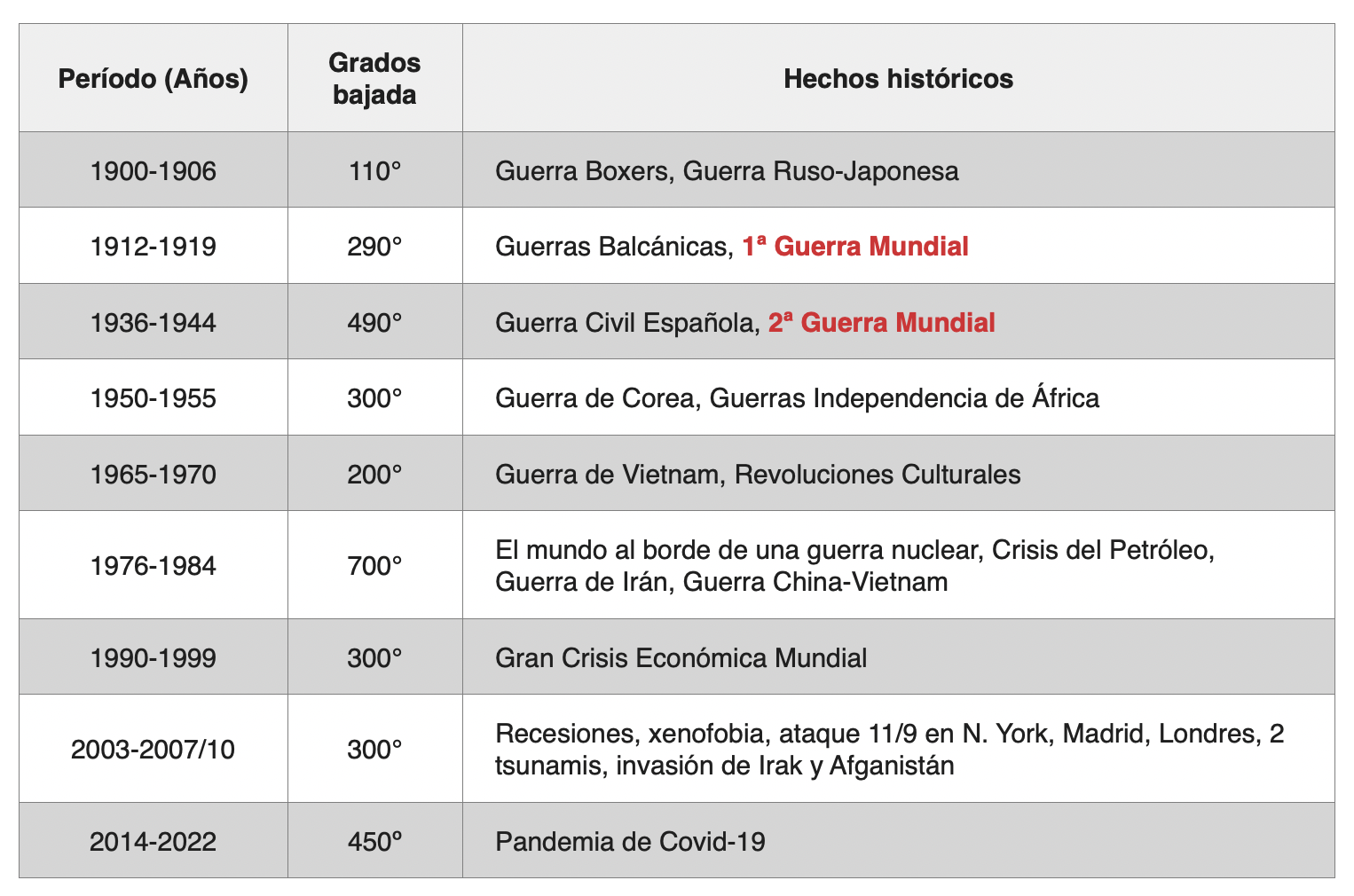 Tabla 1: Correlación entre las bajadas, en grados, del Índice de Concentración Planetaria y los hechos históricos asociados.